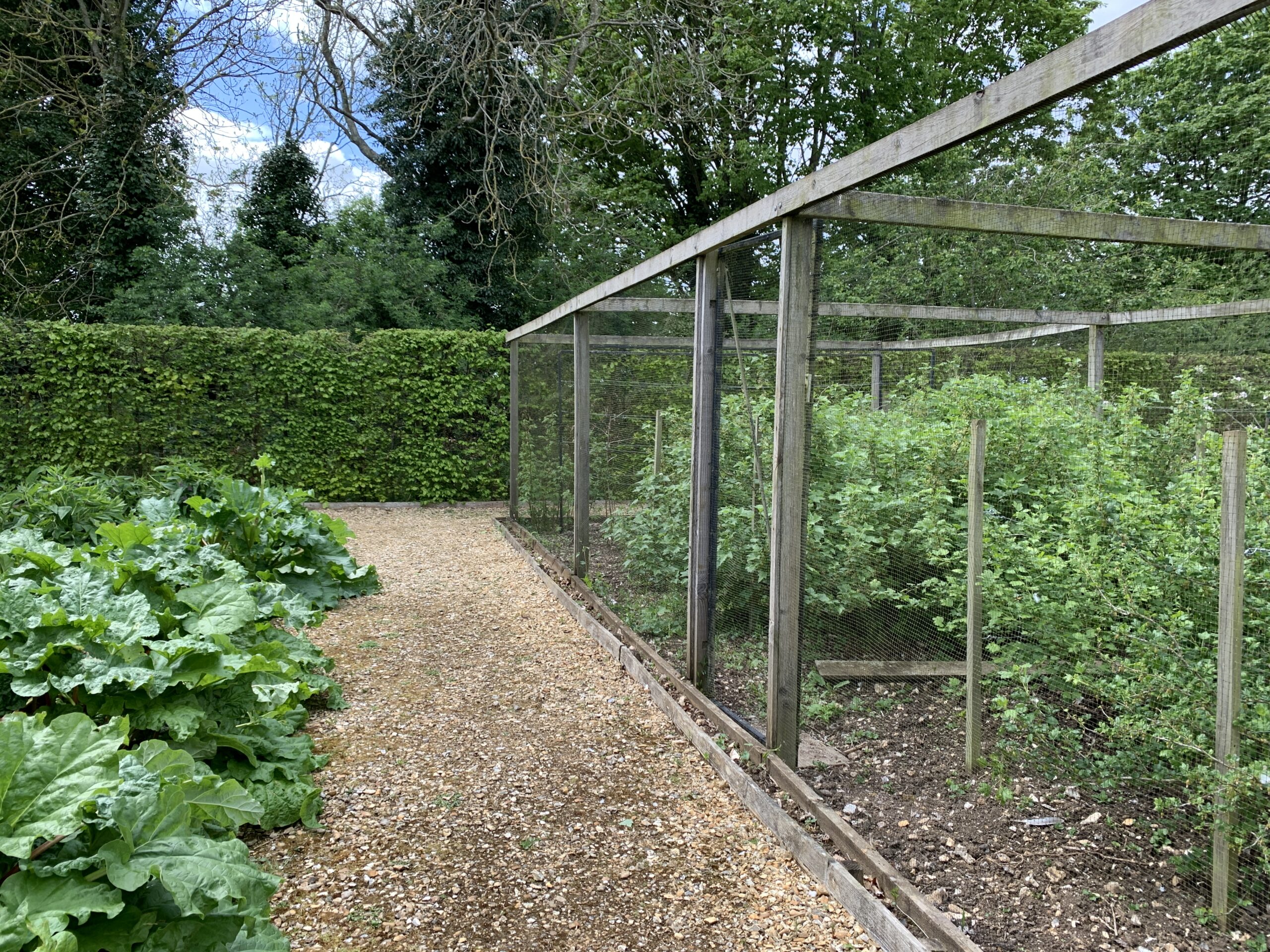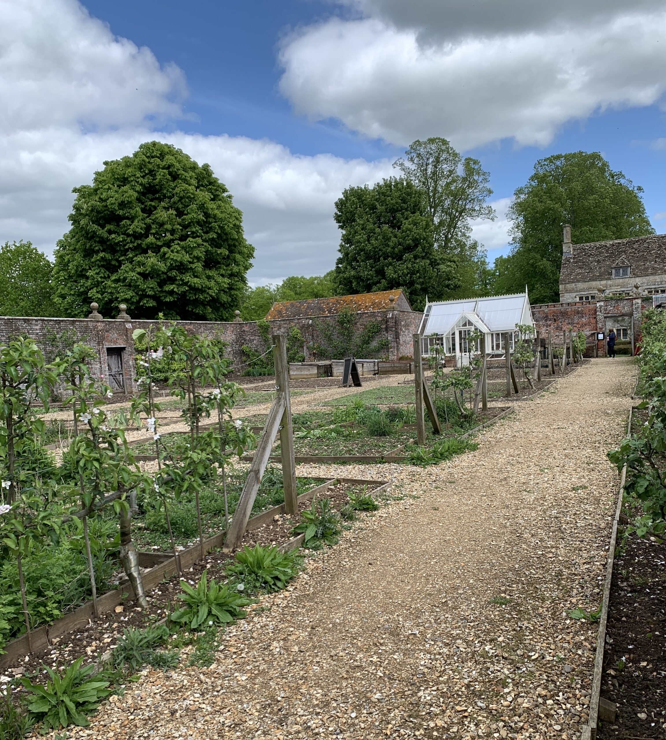 The manor has several gardens, including a large, walled kitchen garden with a greenhouse, espaliered fruit trees, a protected berry patch, and other features.