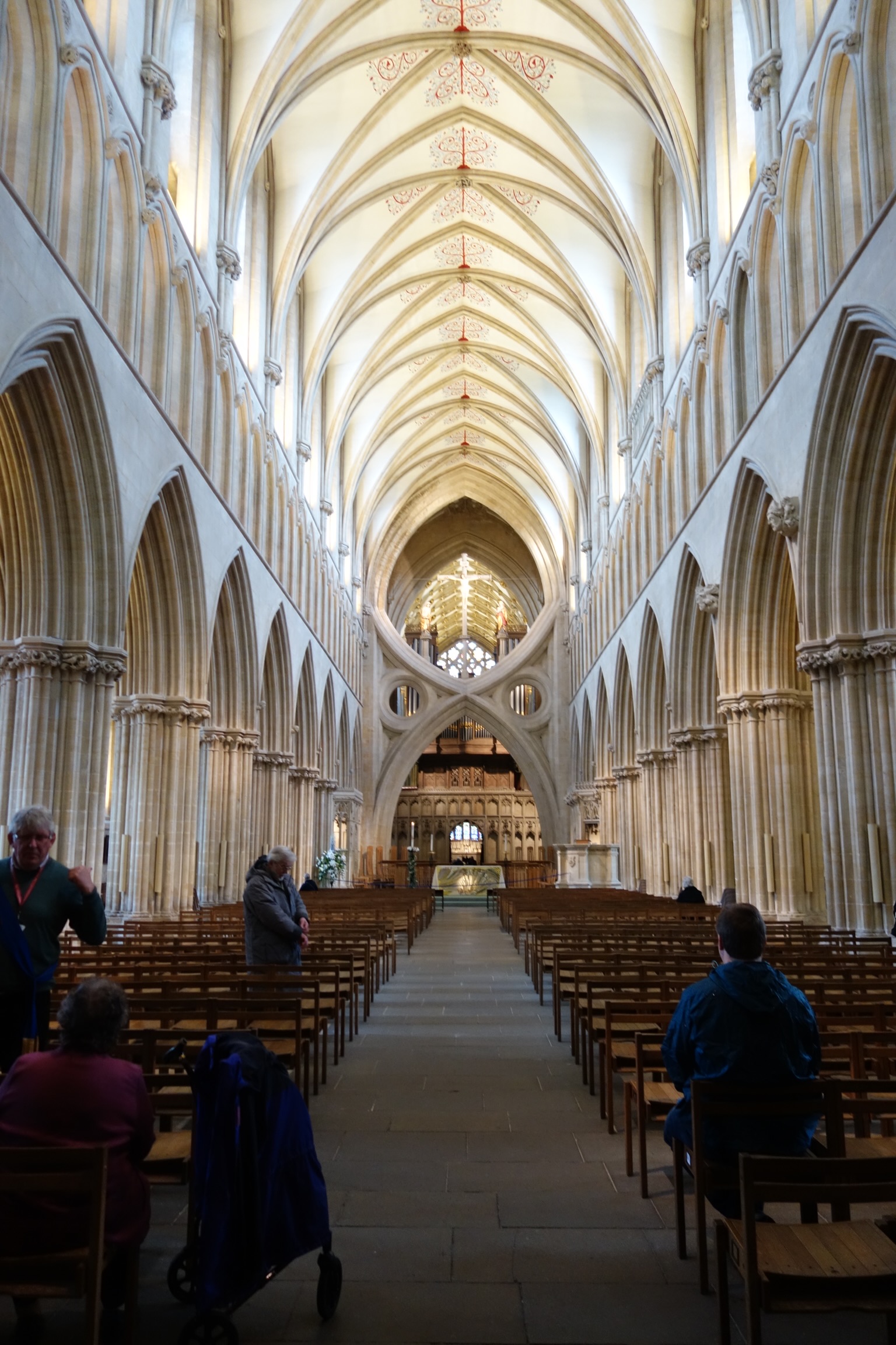 If you’d like to see or learn more, the Wikipedia article on Wells Cathedral has many lovely photos of aspects I was not able to shoot, especially of the famed exterior with its wealth of statuary. There is also a brief, informative YouTube tour of the cathedral. If you’re ever in Bath, make the day trip to Wells–hopefully in drier weather than we had.