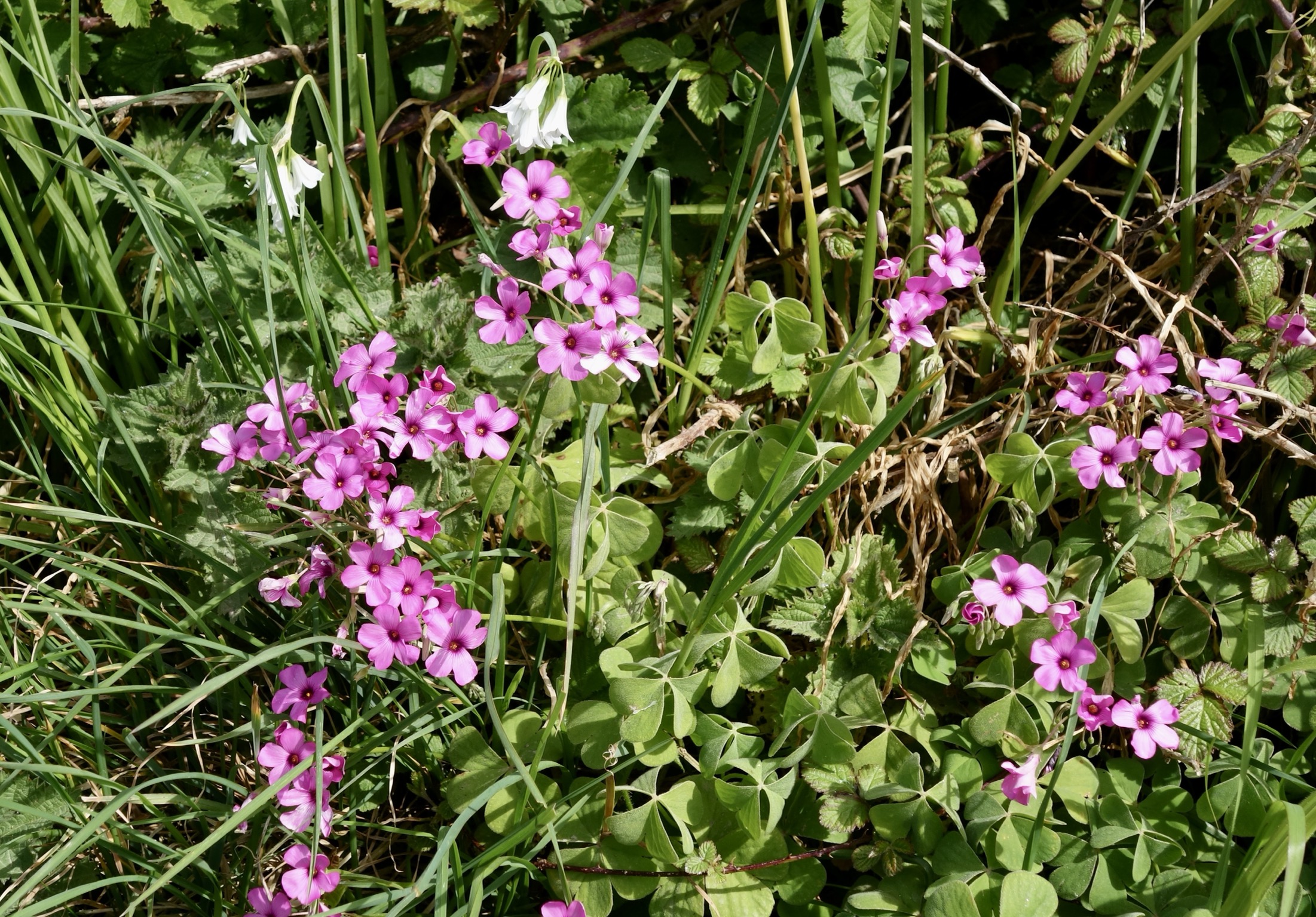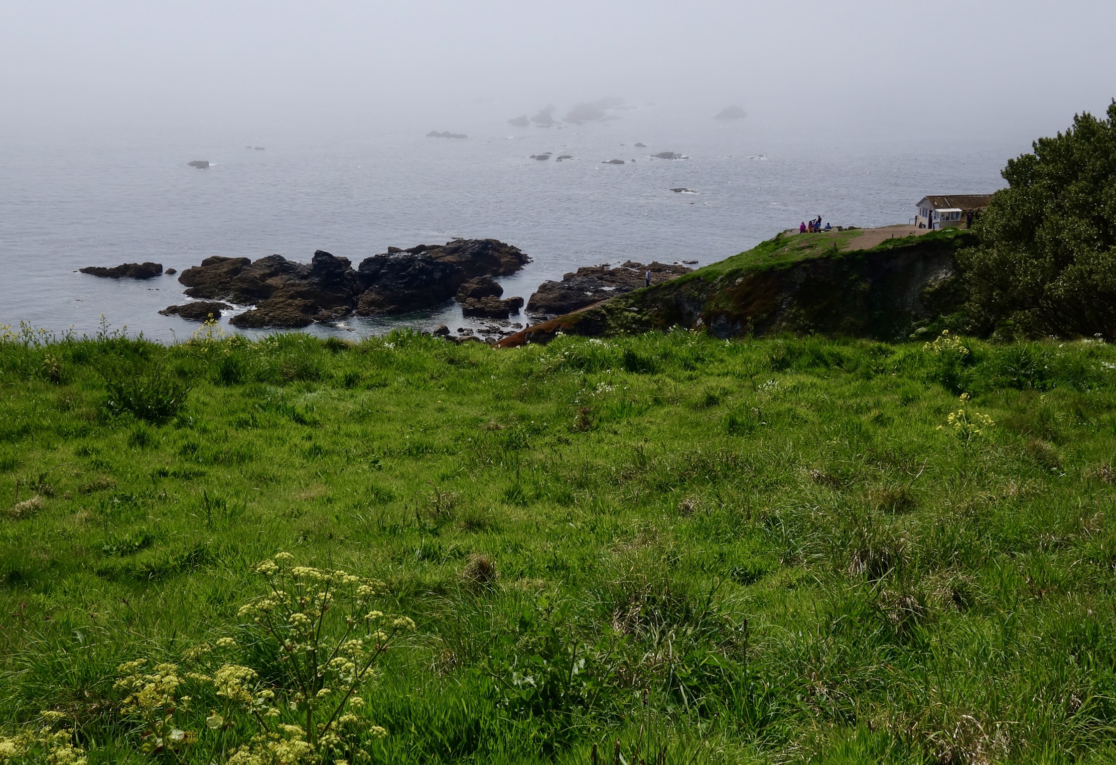 The fog rolled in and out, but gradually dissipated, making a sunny warm day. We walked not quite a mile down a pretty path edged with walls covered in flowers, heading for the lighthouse and the most southerly point of the island. We greeted a few other walkers, but enjoyed having the path almost to ourselves.