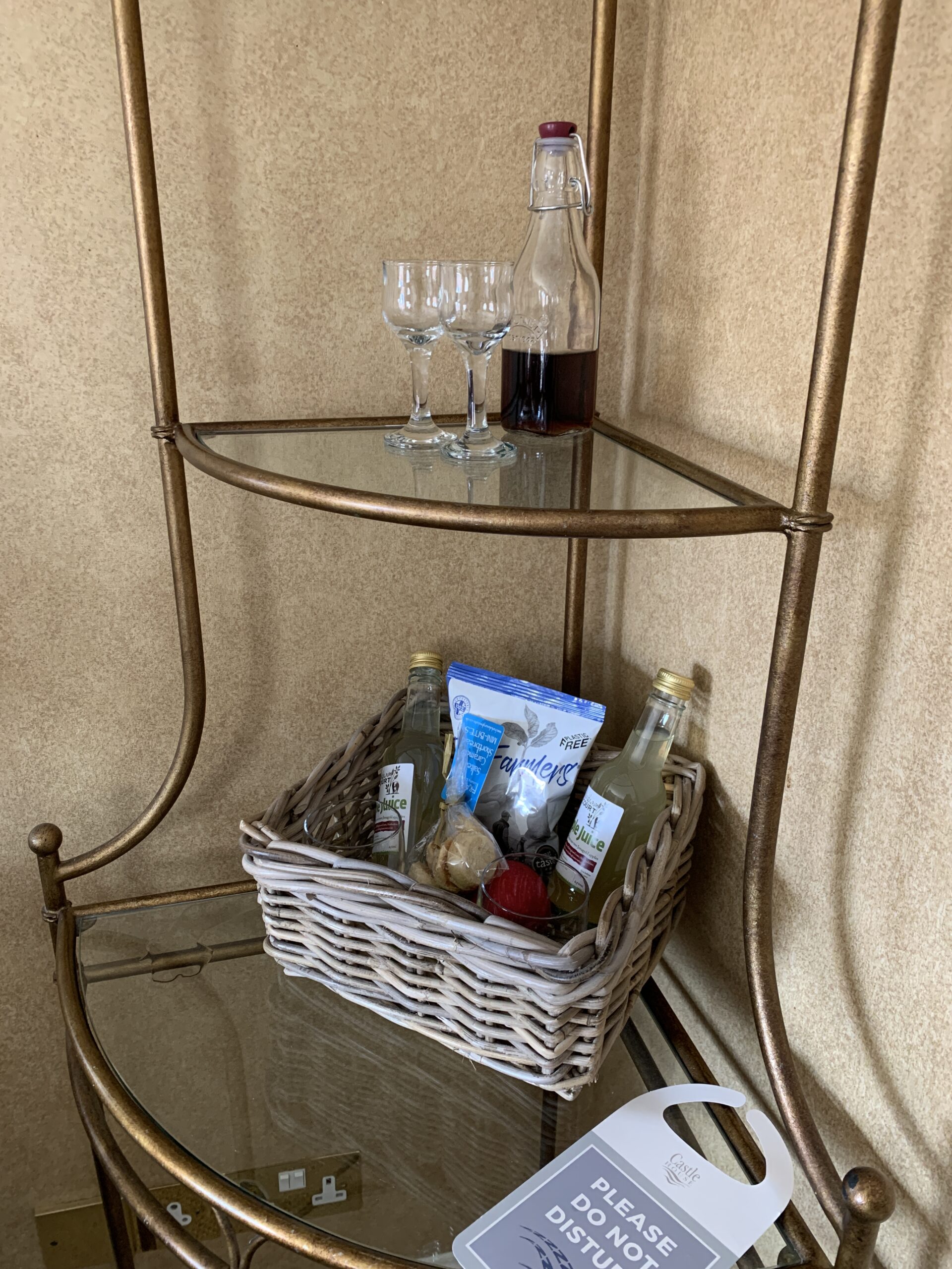 We arrived at the old and very comfortable Castle House Hotel, securing a much sought-after parking spot in the hotel’s small lot. Our room, which overlooked the street, was provisioned with a welcome basket of biscuits, regional cider and fruit–and a small decanter of sherry.