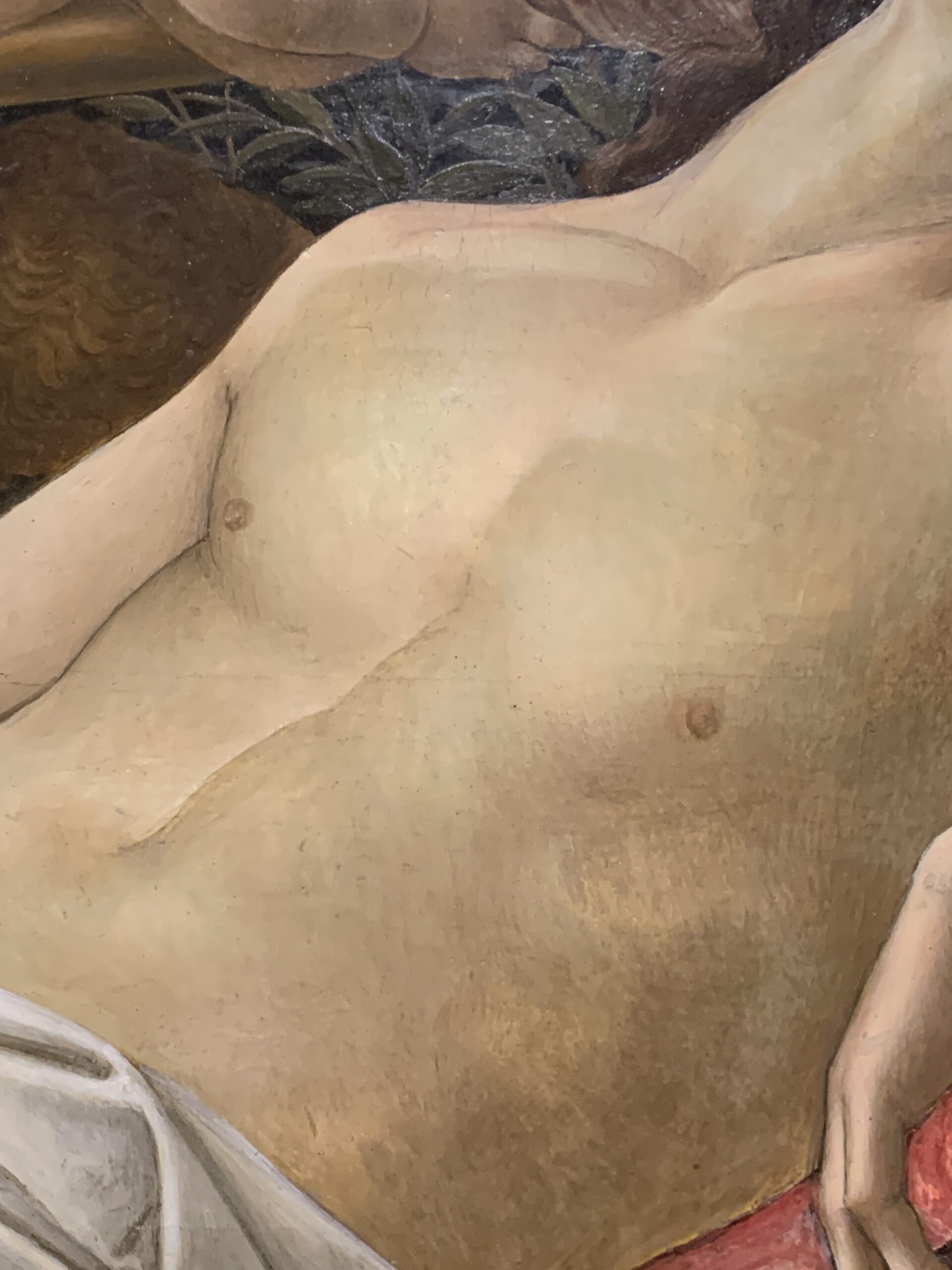 A dull green was used in most egg tempera paintings as an underpainting and modeling tint for flesh. Though Michelangelo finished his paintings in oil, he underpainted them in egg tempera, as this unfinished painting shows.